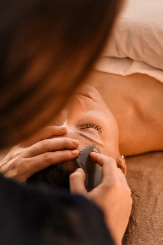 Nežnejša masaža z Gua Sho pa se izvaja na obrazu, vratu in dekolteju. Z nežnim drsenjem in blagim “strganjem” pripomore k sprostitvi mišične napetosti, spodbuja prekrvavitev ter pomaga odpraviti limfne zastoje. Ob redni uporabi lahko ta tehnika zmanjša videz gub, odpravi zabuhlost in pripomore k enakomernejšemu tenu kože.